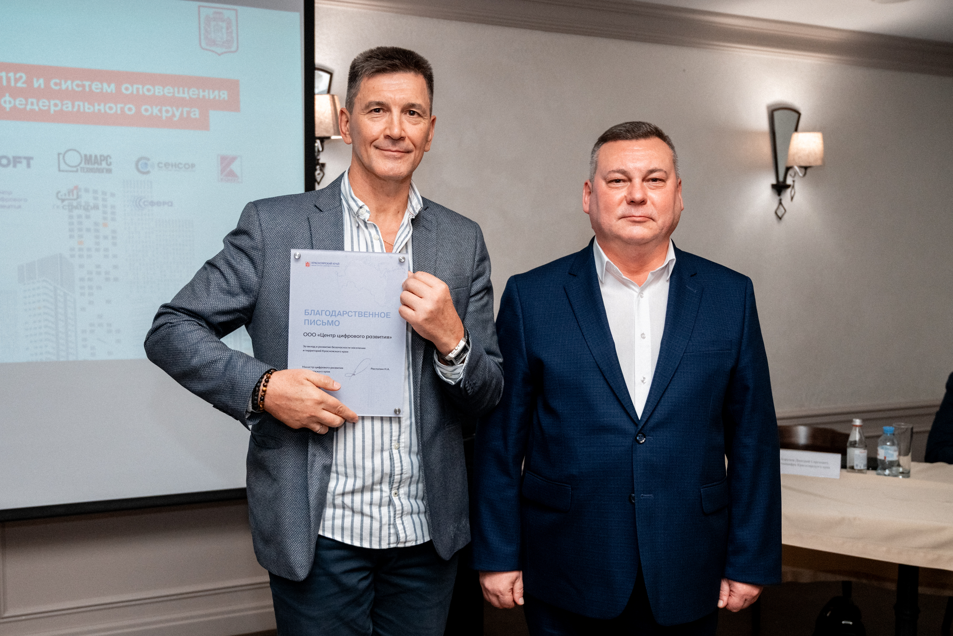 По итогам конференции сотрудникам Центра цифрового развития было вручено благодарственное письмо от Министра цифрового развития Красноярского края Распопина Н.А. за вклад в развитие безопасности населения и территорий Красноярского края.